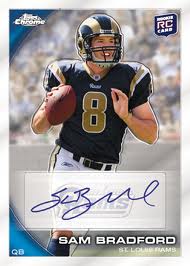 Thus the biggest difference in the two boxes, and one that will be interesting to see how it plays out down the road, is how the baseball box with the two autographs per box but fewer overall hits end up in relation to the football box with only one autograph per box but more hits. Apparently, a lot of people are buying this product. Check out the link: 2010 Topps Chrome football on eBay (over 10,000 listings)