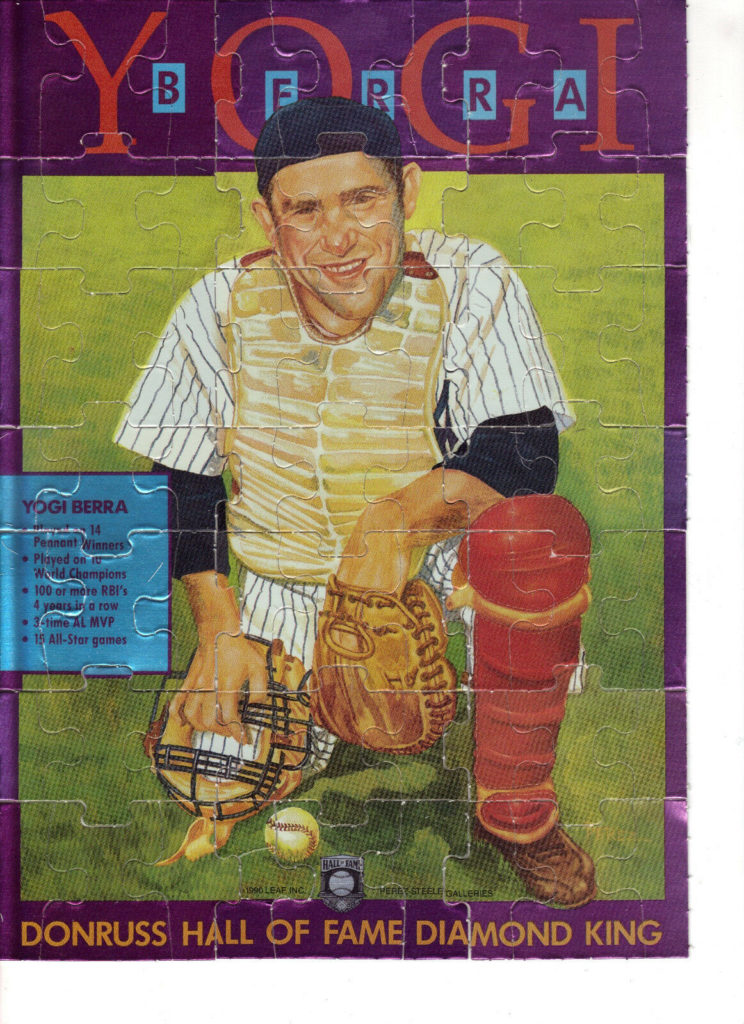 Each pack included a few puzzle pieces that fit with others to make a semi flattering tribute puzzle to all-time Yankees great catcher Yogi Berra in the form of the classic Diamond Kings artwork.