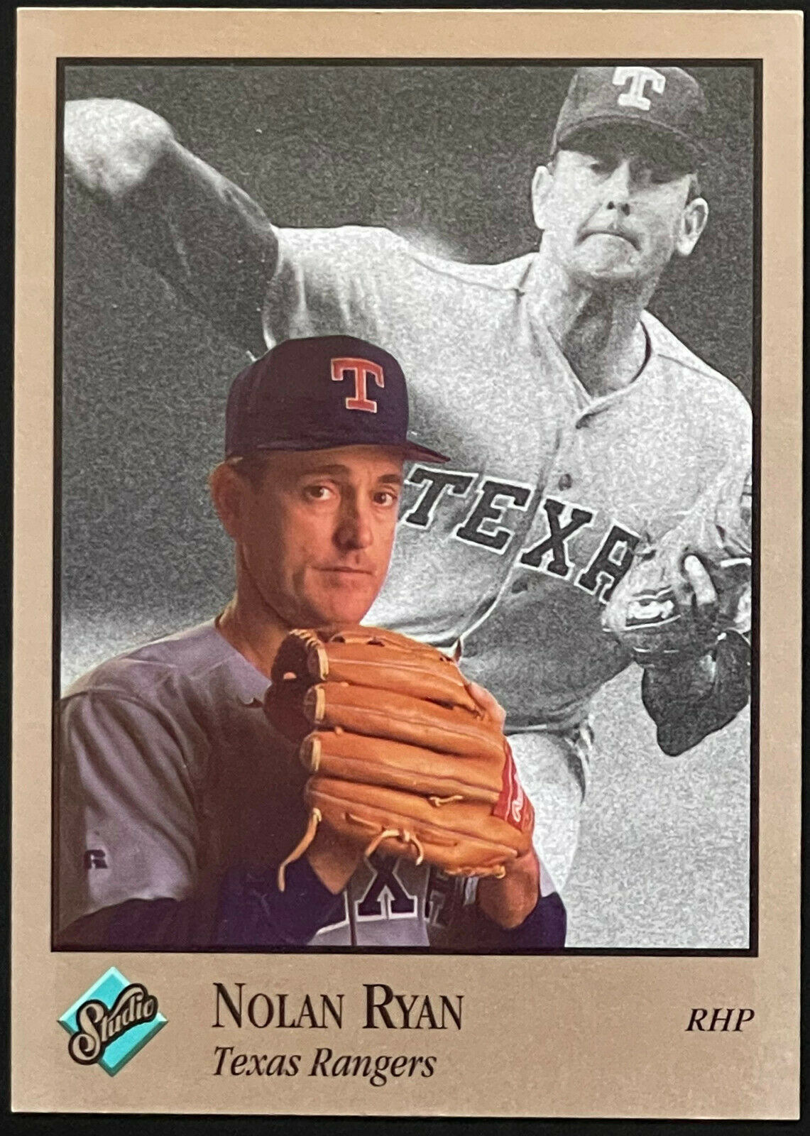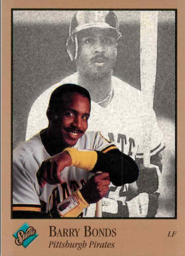 Barry Bonds, still at Pirate at the time, has a card that includes a large black and white photo in the batter’s box and a nice posed image in the forefront with a rare smile.