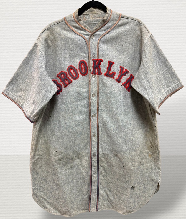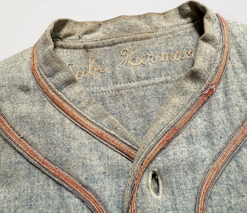 The flannel uniform that Herman wore in 1930 is the only Brooklyn road jersey from that season that is still known to exist. The item, with “Brooklyn” in blue lettering and red trim around the letters, comes with a letter of provenance from Herman’s estate.