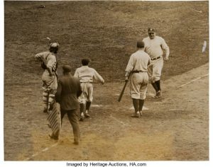 Another photograph shows Babe Ruth crossing the plate after hitting his 60th home run in 1927. It’s an original news photograph and shows Ruth accepting a handshake from Gehrig. The photograph also includes Yankees batboy Eddie Bennett, who doubled as a team mascot and good luck charm.