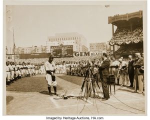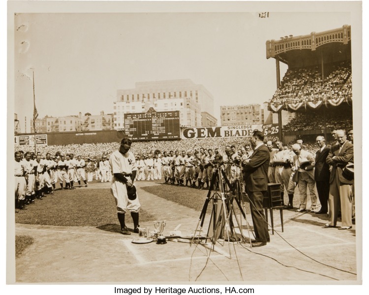 block. The July 4, 1939, “Luckiest Man” speech by the Yankees’ first baseman was one of baseball’s most poignant moments. This original news photograph captures the emotion as Gehrig, head bowed, struggles to keep his composure as he receives accolades.