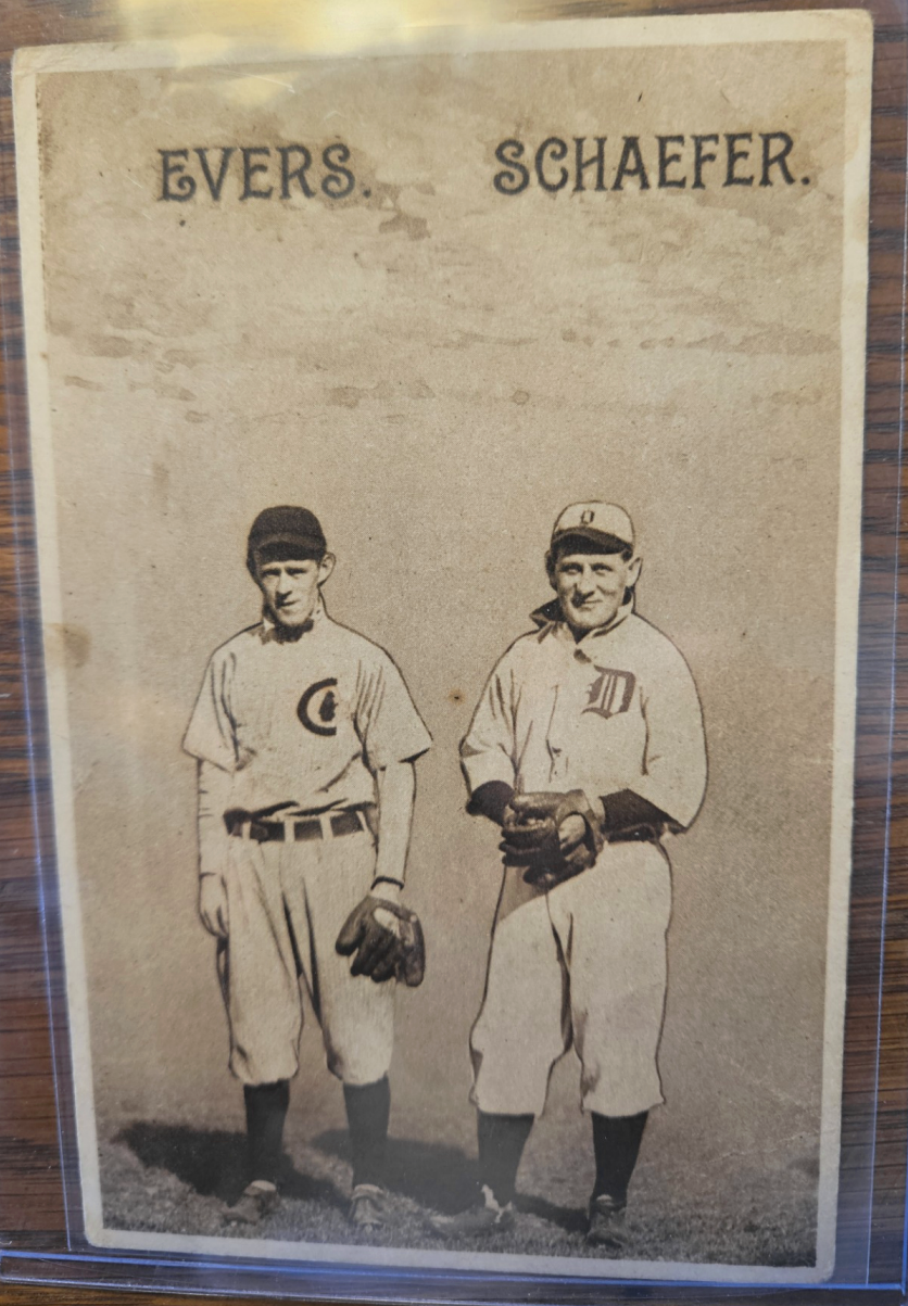 Originating in the collection of a woman who passed away in the 1990s, the collection includes two postcards from the 1910 PC796 Sepia set: Ty Cobb, another featuring Johnny Evers and Germany Schaefer and a few others from the obscure set.