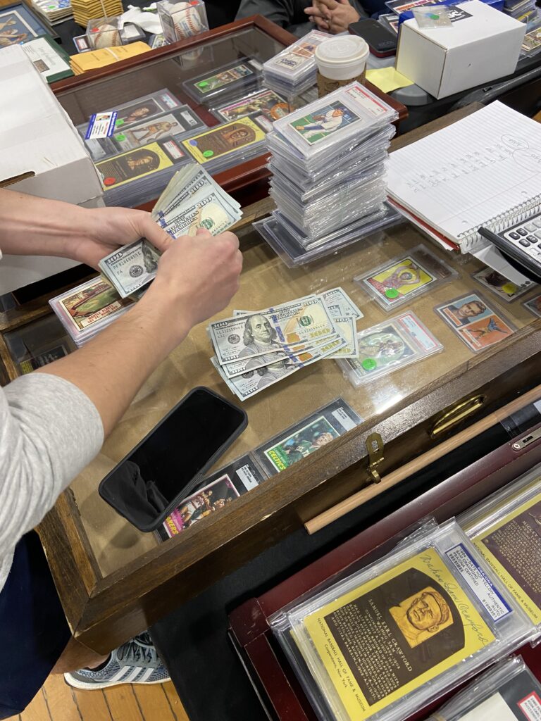 By the time Mike Cance from Portsmouth, NH, was finished, he was forking over $31,350 in cold, hard cash. He handed the dealer three bricks of $100 bills and a stack of loose Benjamins. Cance told me he is one of eBay’s five top sellers (MC-Sports Cards). “I always like big buys of nice, clean vintage,” he said. “In a town like this there’s old money stuff that has been passed down.”