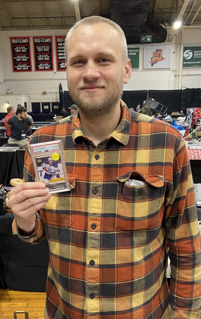 Matt Bennett let me photograph him holding a card that was anything but child’s play. It was a PSA 10 2015-16 Upper Deck Young Guns Connor McDavid, the superstar Edmonton Oilers center, priced at $32,000— the highest priced card I saw on the floor.