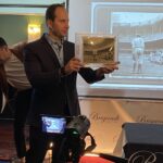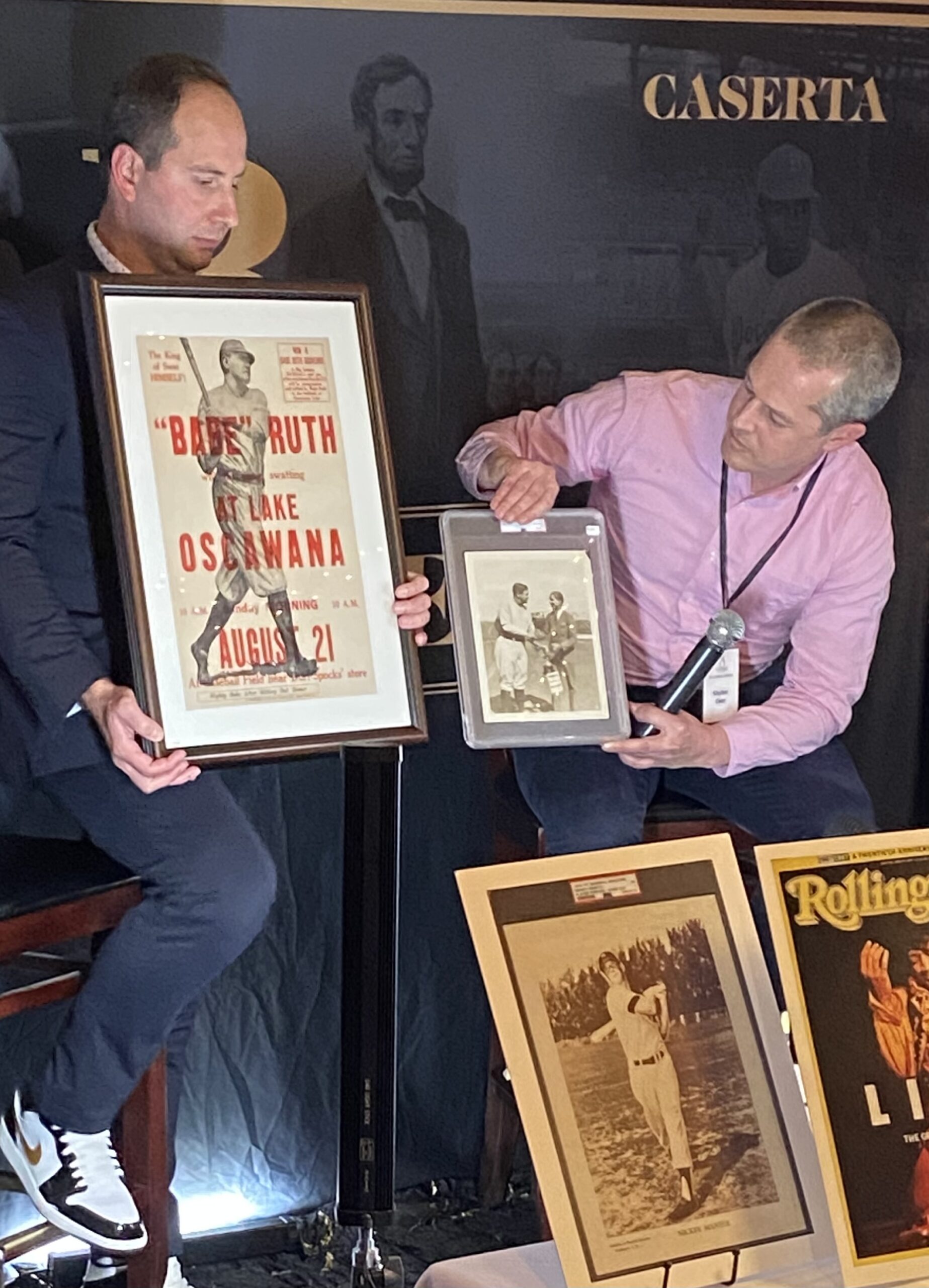 Brigandi shared with Oser and the guests a perfect example of his philosophy. He acquired a striking 1926 barnstorming poster of Babe Ruth at Oscawana Lake in upstate New York. He was examining with a magnifying glass a Type 1 photo of Babe Ruth giving a trophy to a boy in a baseball uniform. The trophy had Oscawana Lake stamped on it, making the photo and poster an ideal pair.
