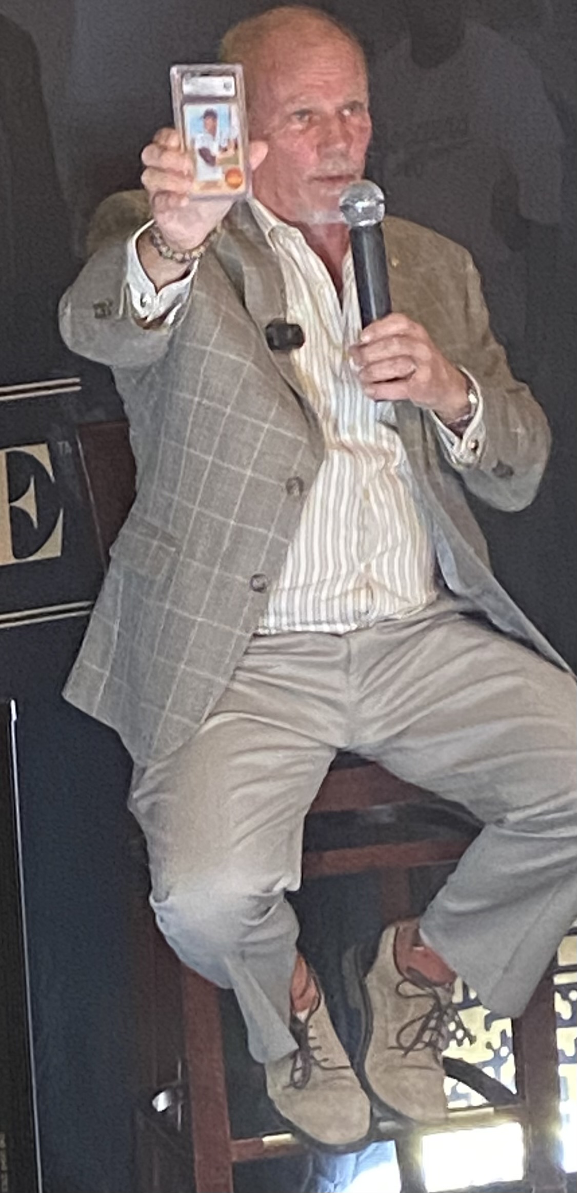 The two least valuable show-and-tell items were the most poignant. Spence had brought along the 1968 Topps Mickey Mantle he pulled from a pack at a candy store back that year. After having Mantle sign it in 1990, Spence kept it in his wallet until it became thoroughly wrinkled. It was the first autographed card CCG authenticated when it bought Spence’s company.