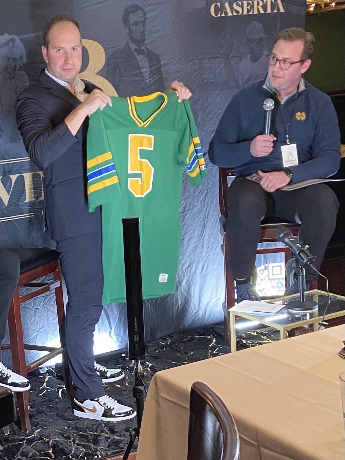 Since serving as Notre Dame’s Fighting Irish equipment manager in college, Eckhart has become a fervid collector of his alma mater. He owns every style of the school’s jersey ever worn— 250 in all. Eckhart brought a a green jersey with a blue stripe on the sleeve worn just one game by a punter in 1983, which he bought from a local collector in South Bend.