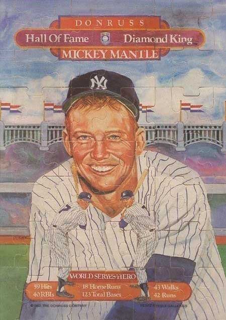 The packs also contained one card, which had three pieces of a Mickey Mantle puzzle labeled a Hall of Fame Diamond King. The Mantle puzzle required 63 pieces to complete it.