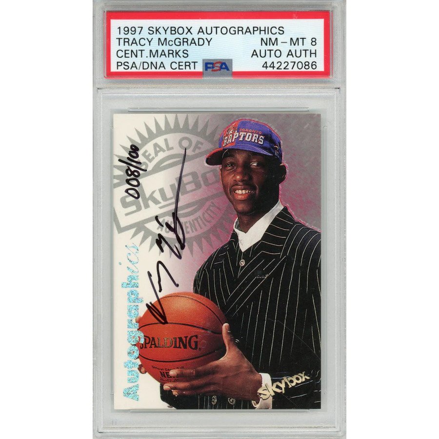 The list of basketball cards includes a 1997 Skybox Autographics Century Marks Tracy McGrady graded PSA 8, a 1996 Fleer Lucky 13 Kobe Bryant graded PSA 9, a sealed box of 2003-04 Topps Rookie Matrix, a Jayson Tatum Boston Celtics 2017/18 Panini Prizm Silver rookie (BGS 9.5), a LeBron James 2019/20 Panini Mosaic Stained Glass #3 Card (BGS 9.5), multiple Ja Morant rookie cards along with others featuring Kevin Durant, Luka Doncic, Trae Young, Joel Embiid and Antetokounmpo.