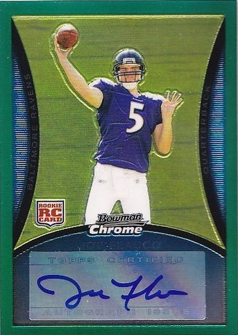 Flacco has signed rookie cards in Upper Deck’s Exquisite brand and Playoff National treasures from 2008 as well.