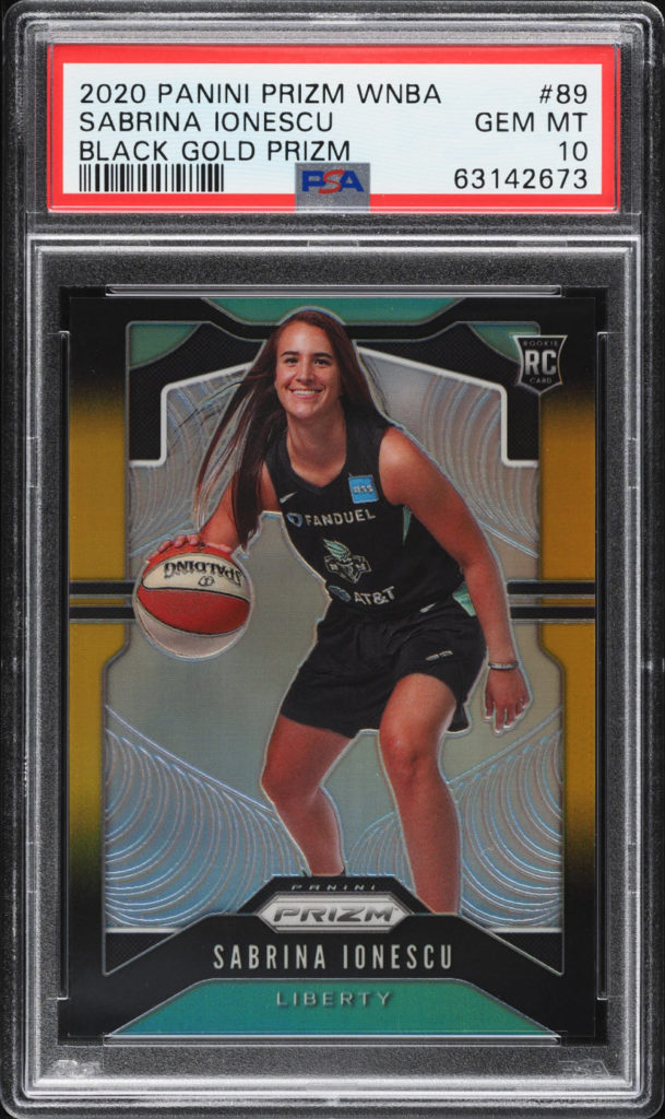 A 2020 Panini Prizm Black Gold Sabrina Ionescu rookie card numbered 5/10 and graded PSA 10 set a record for the highest prices WNBA card ever sold at auction recently.