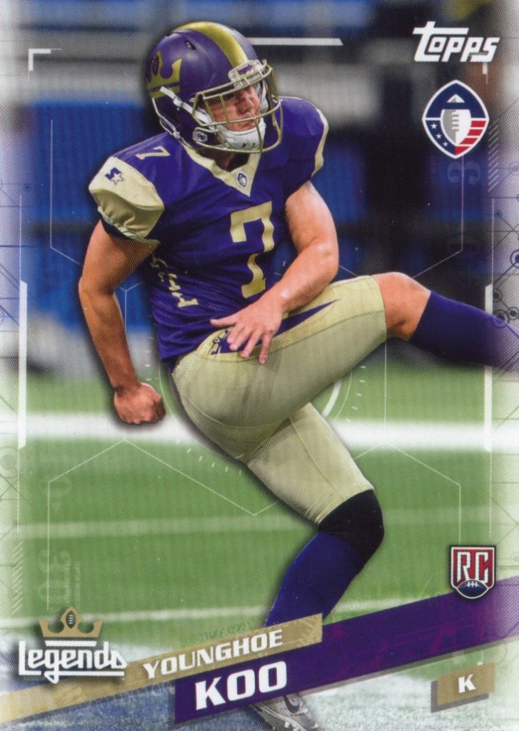 Products from the very brief partnership between Topps and the Alliance of American Football served up the first cards of 26-year-old Younghoe (pronounced YOUNG-way) Koo, the Falcons’ 26-year-old Korean born placekicker. Koo was a kicking sensation for the Atlanta Legends of the now-defunct AAF where he appeared on a Topps Now card and also in the regular 2019 Topps AAF set.