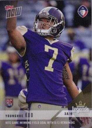 Where Younghoe Koo’s rare AAF Topps Now or his regular Topps rookie card might go no one yet knows. But at less than a dollar for Koo’s regular rookie card and less than $10 for his Topps Now, they are certainly affordable. He also appeared in his NFL uniform inside some of Panini’s 2020 products.