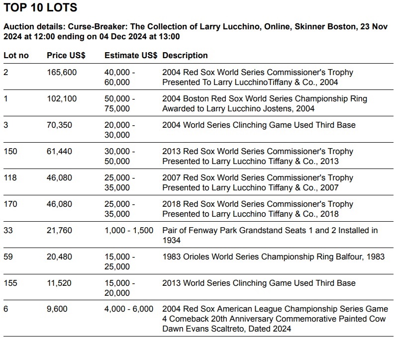 It was one of two items from the memorable 2004 season of the Red Sox to sell for six figures. The other was Lucchino’s 2004 World Series ring, which sold for $102,100 including the buyer’s premium. That was double the expected price.