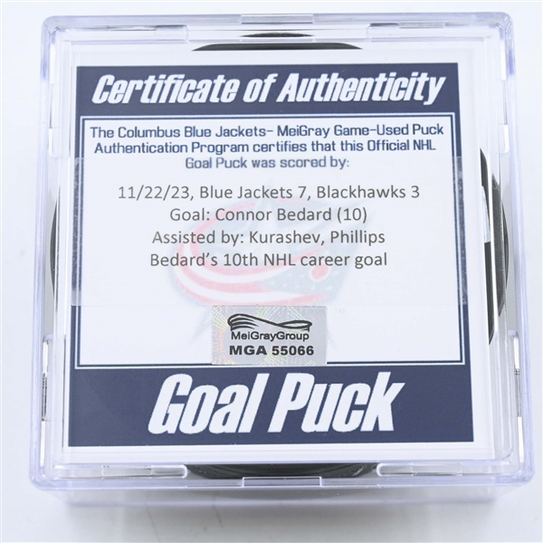 The first goal puck off the stick of NHL rookie Connor Bedard sold for $3,630 Thursday night.
