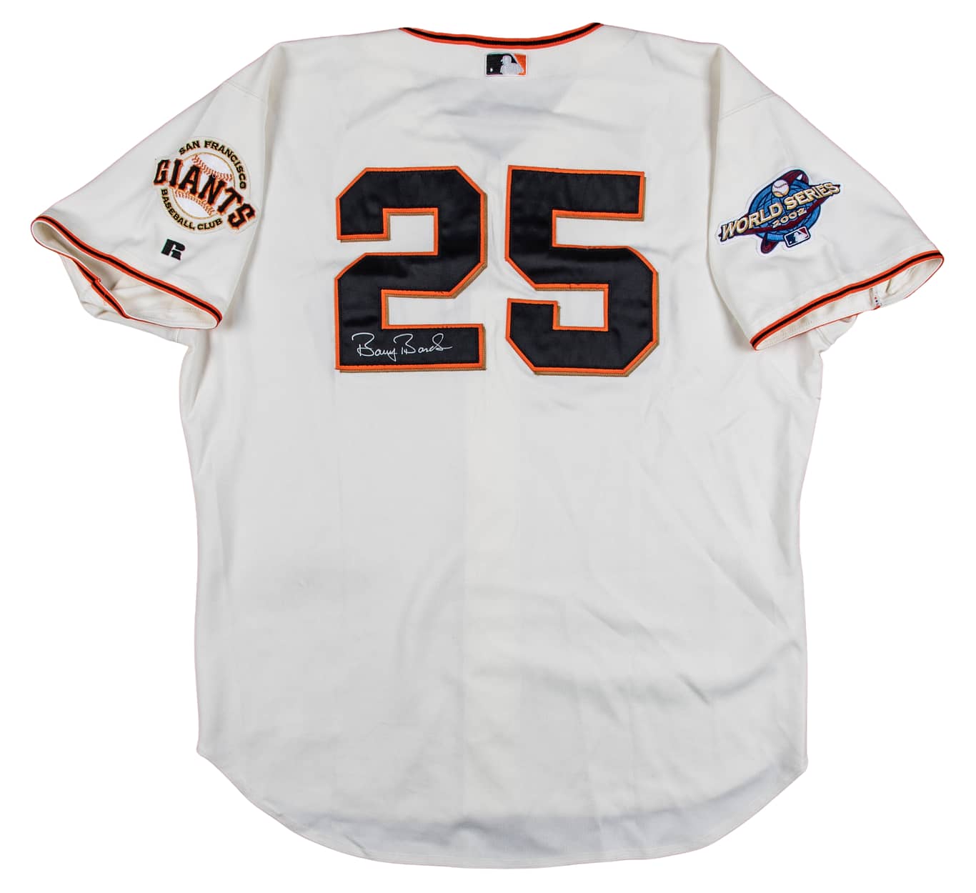 Bonds turned over a 2002 World Series game jersey and 2001 game bat—both now autographed—to the auction.