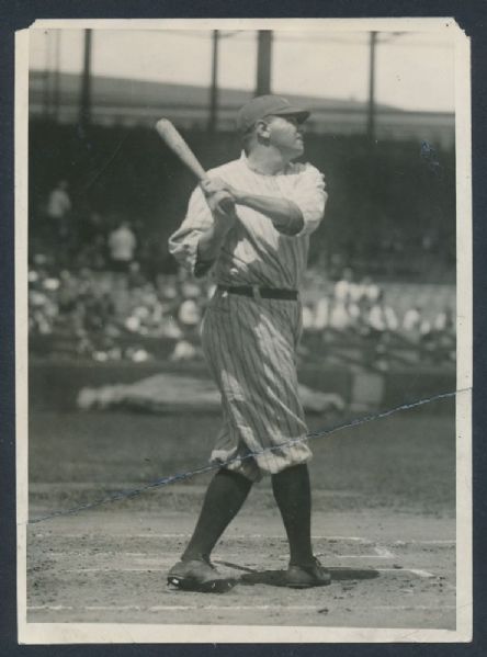 Few original photographs of Ruth’s first season with the Yankees exist, but one is at auction now. Our Vintage Photo of the Day is an International News image of The Babe watching a long drive that had just come off his bat. Bidding interest is strong despite a large crease, an indication of its rarity. Repaired with tape and colored for publication, the photo measures 5×7”.