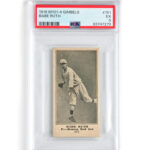 A game model bat dating from 1918-1922 was the top selling item at $156,000 including the buyer’s premium. Right behind was a 1916 M101-4 Sporting News Ruth rookie card. Off-center and grading PSA 2, it still netted $132,000, a record price for the grade. Another Ruth card–a PSA 8 example of his 1933 Goudey Sport Kings–sold for $60,000. A single-signed Ruth baseball graded 7.5 by PSA realized $39,000. In all, the auction included over 90 Ruth items, 16 of which sold for at least $10,000.