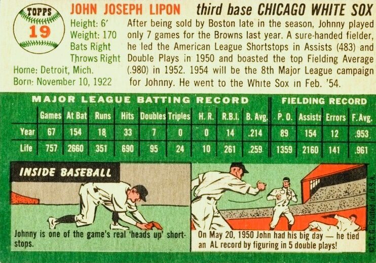 What about the Orioles reference? Well, the Browns moved to Baltimore for the 1954 season and were renamed the Orioles. And because this was a 1954 set, Topps actually got that part right if they were going by the team Lipon was last seen with. But that doesn’t explain the reference to the White Sox on the back.